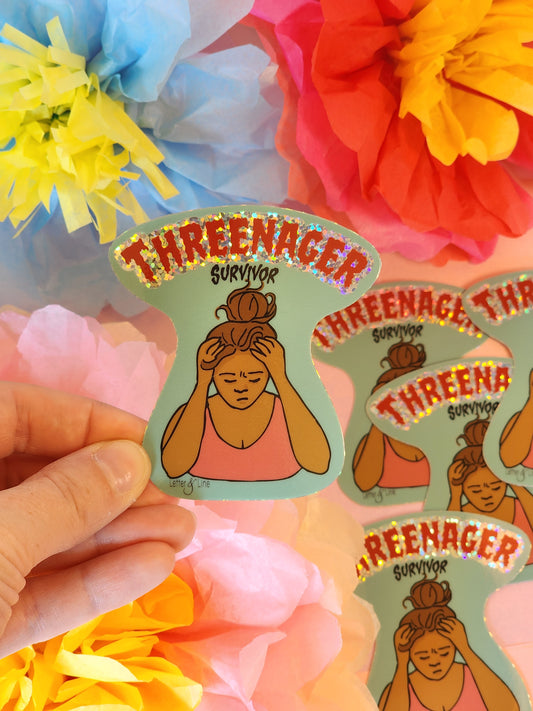 "Threenager Survivor" Glitter Sticker | Funny Achievement Award for Toddler Moms